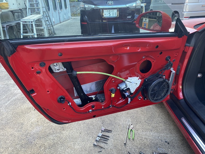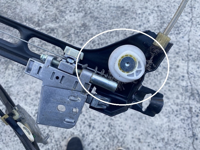 すると、やはりガラスレギュレターのワイヤーが絡まっています。新品のレギュレターに交換して修理は完了です。